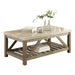 Industrial styling is softened by the blending of natural elements to create a stylish look in the Ridley Collection. A creamy white stone marble top of the cocktail table is supported by the weathered wood finished base of each table – comprised of wood framing that includes display shelving with slat construction and angled supports. Sofa table and end table are also available. 48 x 26 x 20H
