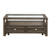 With modern aesthetic subtly guiding the transitional design of the Auburn Collection, this versatile look will be right at home in your living room. A charcoal brown finish is utilized to highlight the birch veneer of the cocktail table. Satin nickel hardware fronts the drawers with inset glass top providing modern complement. Casters on the cocktail table allow for ease of movement within your space. 46 x 26 x 19.5H