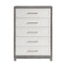 Maximize your bedroom storage with this stylish two-tone 5-drawer chest, featuring a unique ivory and gray finish crafted from okume veneer, wood, and engineered wood. This chest boasts five dovetail drawers with smooth ball-bearing glides, providing ample space for your clothing and belongings. Polished nickel-tone bar pulls add a touch of contemporary elegance, while the sturdy construction ensures durability. Perfect for any bedroom, this chest combines style and functionality. Assembly is required.