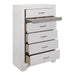 The unique styling of the Luster Collection presents a glamorous option for your bedroom. Embossed faux-wood veneer features a white finish that allows for the acrylic silver glitter fronts of the hidden jewelry drawers to shine. The jewelry drawers feature felt lining to protect your hidden items from wear and tear. The panel headboard features acrylic silver glitter accent banding as well as a silver faux leather channel-padded insert. Polished chrome bar drawer pulls front the drawers providing complementing contrast to the collection’s finish.